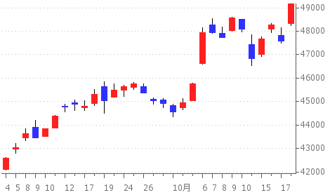 週中は材料出尽くしによる調整を挟んだものの、24日には再び最高値を更新し4万9300円台を回復しました。
